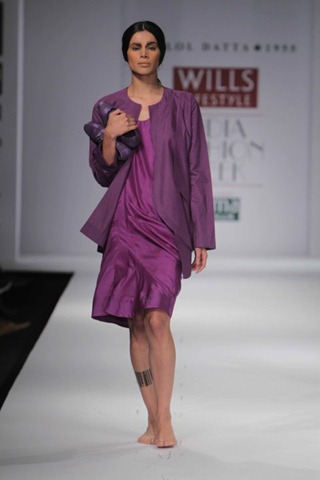 Kallol Dutta's collection has muted tones and deep printed purples. The pieces were all slightly draped and bossy skimming. The crop jackets were some of the interesting elements in the show. The collection included purples ,cream , grey . Cuts are very new and interesting.
